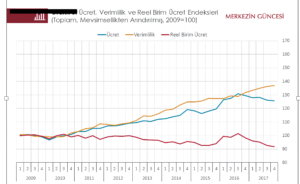 Merkez bankasının bir araştırmasına göre; 2009-2017 arasında ücret artışları kendinden daha yüksek verimlilik artışı yaratmıştır. (Aşağıdaki Grafik ) Buna rağmen yeni MB başkanının ‘’ücret artışı enflasyon yaratır ‘’demesi, MB ve politikalarına olan güveni sarsmıştır.