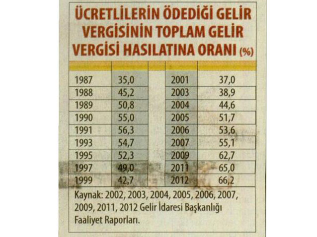 Gelir Vergisi Kanunu’nda yer alan yedi gelir unsuru arasında, ticari kazanç, zirai kazanç, serbest meslek kazancı, kira geliri gibi en fazla vergi ödeyen kesim ücretliler… Ücretlilerin ödediği toplam vergi, gelir vergisinden elde edilen hasılatın yarısını geçmiş hatta üçte ikisine ulaşmış durumda… Tablodan da fark edileceği gibi, ücretlilerin ödediği vergi, toplam gelir vergisi hasılatına göre her yıl artıyor.