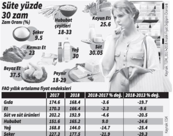 2018’de uluslararası süt ve süt ürünleri yüzde 4.6 ucuzladı, Türkiye’de yüzde 30 zamlandı. Dünya 2018’de yüzde 2.3 daha ucuza et yerken, Türkiye’deki et fiyatları yüzde 23-38 arttı.