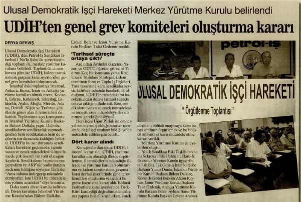 Ulusal Demokratik işçi Hareketi (UDİH), dün Petrol-lş Sendikası istanbul 1 No´lu Şube´de gerçekleştirdiği toplantı da, merkez yürütme kurulunu belirledi. Toplantıda alınan karara göre ise UDİH, kıdem tazminatının gaspına karşı işyerleridne genel grev komiteleri oluşturacak.