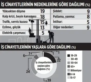İşçilerin ölüm sebebine ilişkin veriler incelendiğinde iş cinayetinde yaşamını yitirenlerin yüzde 19’u yüksekten düşme, yüzde 18’i kalp krizi, beyin kanaması, 15’i trafik ve servis kazalarında, yüzde 13’ü ezilme ve göçük nedeniyle yaşamını yitirdi. Ölenlerin en az 11’i kadın, 18’i göçmen, 4’ü çocuk işçiydi. Ekim ayında dört çocuk işçinin ölümüyle beraber bu yılın ilk on ayında ölen çocuk işçi sayısı 61’e ulaştı.