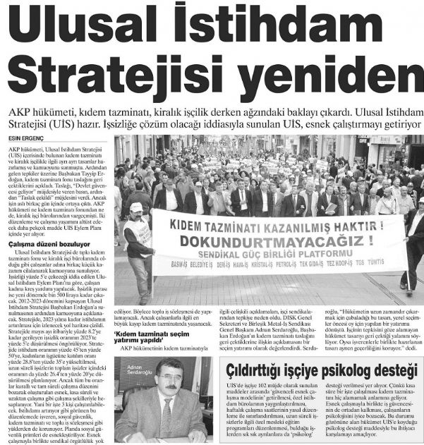 AKP hükümeti, Ulusal İstihdam Stratejisi (UİS) içerisinde bulunan kıdem tazminatı ve kiralık işçilikle ilgili ayrı ayrı tasarılar hazırlamış ve kamuoyuna sunmuştu. Ardından gelen tepkiler üzerine Başbakan Tayyip Erdoğan, kıdem tazminatı fonu taslağını geri çektiklerini açıkladı.