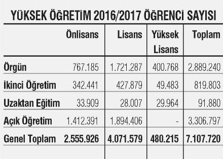 2016- 2017 yılında, yüksek öğrenimde toplam kayıtlı olan öğrenci sayısı içinde örgün öğretimde olanların oranı yüzde 40.65’tir. Buna karşılık açık öğretimde okuyanların oranı daha yüksek yüzde 46.52’dir. (Aşağıdaki Tablo )