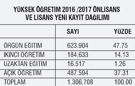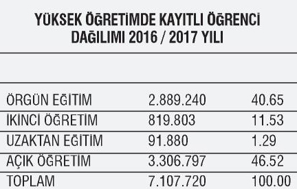 2016 / 2017 yılında ön lisans ve Lisans için 1 306 707 kişi kayıt yaptırdı. Bunun yarıdan azı yüzde 47.75’i örgün eğitime yüzde 37.5’i açık öğretime girdi. Belki ikinci eğitimde bir yere kadar mazur görülebilir.