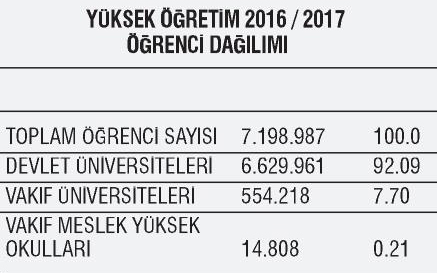 Türkiye’de 2017 yılı itibarıyla 186 üniversite vardır. Bunlardan 119’i devlet üniversitesi, 67’ü vakıf üniversitesidir. Ancak vakıf Üniversitelerinde okuyan öğrenci sayısı toplam içinde yüzde 7.7 dir.
