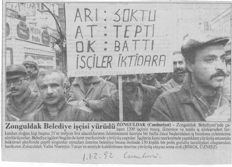 1992 yılı sonlarında Zonguldak’taki belediye işçilerinin bir eyleminde taşınan pankart da son derece ilginçti. “ARI: SOKTU; AT: TEPTİ; OK: BATTI; İŞÇİLER İKTİDARA” idi (Cumhuriyet, 1.12.1992).