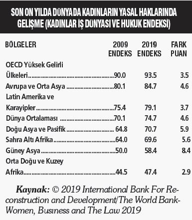 Dünyada 2019 yılında, on yıl öncesine göre kadın hakları endeksinde en fazla ilerleme 8.4 puan artışla Güney Asya’da oldu.