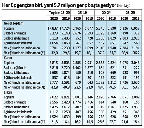 Sonrasında artış başladı. 2019 yılında 5 milyon 230 bine çıkan ne eğitimde ne istihdamda olan genç nüfus, geçen yıl 5 milyon 701 bine ulaştı.