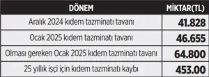 Kıdem tazminatı tavanı Ocak 2025 yılı için 46 bin 655 TL olarak belirlendi. Oysa kıdem tazminatı tavanı enflasyon oranı kadar artsaydı 48 bin 700 TL civarında, eğer ilave ödeme de dikkate alınsaydı 65 bin lira civarında olacaktı.