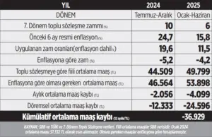 Ocak 2025’te memur maaş artışları ve memur emeklilerinin aylıklarındaki artış ise daha da dramatik oldu. Daha önce defalarca yazdığım gibi memurlar ve memur emeklileri toplu sözleşmedeki tuhaf düzenleme yüzünden Temmuz 2024’te olduğu gibi Ocak 2025’te de enflasyonun altında zam aldılar. Hem de öyle böyle değil. Yıllık resmi enflasyon yüzde 44,4 olurken, memurların son bir yıllık maaş artışı yüzde 33’te kaldı. Temmuz 2024’te yüzde 24,7 enflasyon karşısında yüzde 19,6 zam alan memurlar Ocak 2025’te de yüzde 15,8’lik enflasyon karşısında yüzde 11,5 zam aldılar. 7. Dönem toplu sözleşmedeki hüküm nedeniyle yaşanan bu kayıp karşısında yetkili sendika Memur-Sen hiçbir ciddi eylem ve iş bırakma yapmadı. Son derece kısık sesle yaptıkları “refah payı” yalvarmaları da sonuç vermedi. Böylece ortalama memur maaşında aylık kayıp 4 bin 100 lira civarına yükseldi. Memurların yıllık kümülatif kaybı 37 bin lira civarında oldu. Bu uygulama Temmuz 2025’te de devam edecek. Böylece üç yarı yıl boyunca memurlar ve emeklileri enflasyonun altında ezilecek.