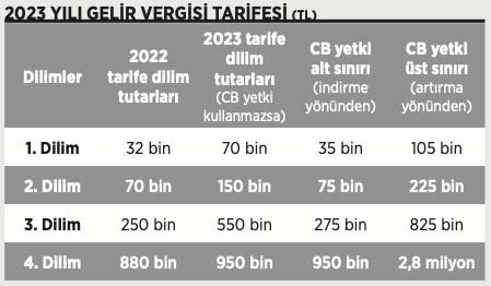 Hazine ve Maliye Bakanı Nureddin Nebati, 2023 yılı ücret gelirlerinde uygulanacak gelir vergisi tarifesini açıkladı. Buna göre gelir vergisi tarifesinin ilk dilimi 32 bin liradan 70 bin liraya çıktı. Nebati, “2023 yılında, uygulamaya devam ettiğimiz asgari ücret istisnası nedeniyle, tüm ücretli çalışanlar, yıllık 120 bin 96 liraya isabet eden ücretlerinden gelir ve damga vergisinden muaf olacaktır” dedi. Öte yandan Nebati, bu yıl temmuz ayında 51 liraya çıkan yemek parası istisna tutarını 110 liraya, yol parasının ise 56 liraya çıkarıldığını belirtti.