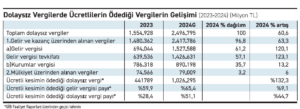 TEPAV bülteninde, 2024’te vergi gelirlerindeki yüzde 62,3 artışa gelir vergisi tevkifatının yüzde 28,1’lik katkısına dikkat çekildi. Ücretliler ve menkul kıymetler üzerinden yapılan kesinti “belirleyici” olarak nitelenen bültende, “yaptığımız hesaplamada toplam vergi gelirleri tahsilatı içinde yaklaşık yüzde 35’ler seviyesinde olan dolaysız vergilerin yüzde 41’ine ulaşan kısmı ücret nitelikli gelir elde edenler tarafından ödenmektedir. Gelir vergisi tahsilatı içinde ise ücretlilerin payı 2024 yılında tahmini olarak yüzde 65’lere çıkmıştır” yorumu yapıldı.