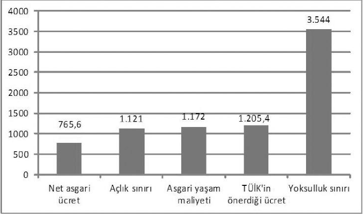 TÜRKİYE’de net asgari ücret, 765.6 TL, DİSK-AR’ın hesaplamalarına göre açlık sınırı 1.121 TL Asgari ücret, dört kişilik bir ailenin aylık asgari gıda harcamalarının ancak yüzde 68’ini karşılıyor. Türk-iş’in hesaplamasına göre tek bir işçi için aylık asgari yaşam maliyeti, 1.172 TL. Asgari ücret, bu rakamın ancak üçte ikisine denk geliyor. DİSK-AR’ın hesaplamalarına göre dört kişilik bir ailenin yoksulluk sınırı 3.544 TL. Dört kişilik bir ailenin yoksulluk sınırını geçmesi için haneye en az 5 asgari ücret girmesi gerekiyor. Devletin resmi istatistik kurumu olan TÜİK Asgari Ücret Tespit Komisyonuna asgari ücretin en az 1.205,4 TL olması gerektiğini söyledi. Oysa Komisyon, bu tutarın 440 TL daha azını belirledi.