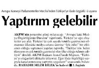 Avrupa Konseyi Parlamenterler Meclisi (AKPM) Başkanı Jean-Claude Mignon, Türkiye’ye “Olağanüstü dikkatle izliyoruz. Eğer ifade özgürlüğü saygıyla karşılanmıyorsa yaptırım uygulanır” uyarısında bulunurken Meclis’in perşembe günü oylayacağı ve içinde Türkiye’ye yönelik ağır eleştirilerin yer aldığı “Avrupa’daki Medya Özgürlüğünün Durumu” raporunda, Türkiye’de çok sayıda tutuklu gazetecinin olmasının ülkedeki medya ortamı üzerine “felç edici” bir etkisinin olduğu saptaması yapıldı.