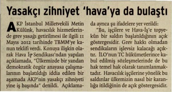 AKP İstanbul Milletvekili Metin Külünk, havacılık hizmetlerinde grev yasağı getirilmesi ile ilgili 11 Mayıs 2012 tarihinde TBMM’ye kanun teklifi verdi. Konuya ilişkin olarak Hava İş Sendikası’ndan yapılan açıklamada, "Ülkemizde bir yandan demokratik özgür anayasa çalışmalarının başlatıldığı iddia edilen bir aşamada AKP’nin yasakçı zihniyeti yine iş başında" denildi.