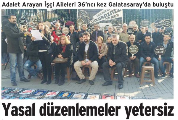 Adalet Arayan İşçi Aileleri 36´ncı kez Galatasaray´da buluştu Yasal düzenlemeler yetersiz İş cinayetlerinde yaşamını yitiren işçilerin aileleri, işçi sağlığı ve güvenliğine ilişkin son yasal düzenlemeleri değerlendirdi: Yeterli görmüyoruz, günü kurtarmaya çalışıyorlar