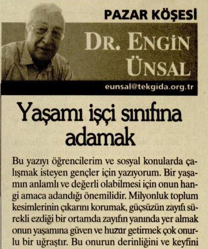 Grev çadırında bir somun ekmeği grevci işçiyle bölüşmek, protesto yürüyüşünde işçilerle yanyana yürümek, grev nedeni ile hapse atılanların duruşmalarından özgürlük çığlıkları ile çıkmak, işçi evlerinde çorbayı birlikte içmek, genç işçiler için kız istemeye gitmek ve işçilerin saz ile çaldığı ezgileri dinlemek kadar insana huzur veren bir başka yaşam düşünemiyorum.