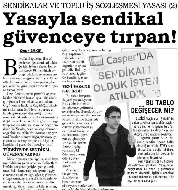 Gezici Araştırma Şirketi’nin Vatan gazetesi için yaptığı araştırmaya göre, her iki işçiden biri, “işten atılmaktan korktuğu” için sendikaya üye olmadığını söylüyor.? İşçilerin yüzde 77,7’si özgürce sendika seçme hakkı olmadığını, yüzde 87,9’u sendikaya üye olduğu takdirde, işveren tarafından cezalandırılacağını düşünüyor.?Yeni yasanın işte bu tabloyu değiştirmesi gerekirdi. Yasa, bunu değiştirmek bir yana, iş güvencesi kapsamı dışındaki işçilerin sendikal tazminat hakkını da yok ederek, tabloya bir kara daha çaldı.