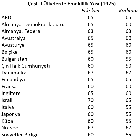 1975 yılında çeşitli ülkelerde yaşlılık aylığına (emekliliğe) hak kazanmak için erişilmesi zorunlu olan yaş aşağıda sunulmaktadır (U.S.Department of Health, Education and Welfare, Social SecurityAdministration, Social Security Programs Throughout the World-1975, Washington,D.C., 1976):