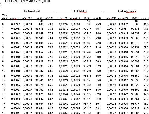 Türkiye İstatistik Kurumu’nun 2017-2019 döneminde Türkiye’de çeşitli yaşlarda kalan ömür beklentisi verileri aşağıda sunulmaktadır.