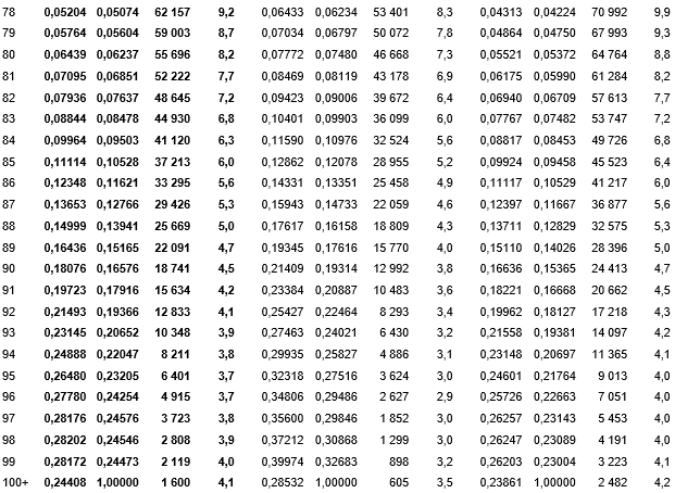 Bu çizelgeye göre, 58 yaşında yaşlılık aylığına hak kazanacak bir kadının önünde ortalama olarak 25,7 yıl daha vardır. 58 yaşındaki bir erkeğin de 21,7 yıl daha yaşaması beklenmektedir.