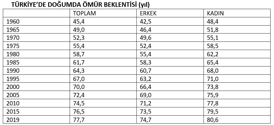 Devlet İstatistik Enstitüsü’nün raporuna göre, Türkiye’de doğumda yaşam beklentisi 1935-1940 döneminde yalnızca 35,43 yıldı. Bu süre erkeklerde 34,68 ve kadınlarda 36,23 yıldı. Bu yıllarda çocuk ölümlerinin çok fazla olması, ortalamayı epeyce düşürüyordu. 1940-1945 yıllarında İkinci Dünya Savaşı’nın yoklukları ve sıkıntıları yaşandı. Doğumda yaşam beklentisi 31,34 yıla düştü. Bu süre erkeklerde 30,10 ve kadınlarda 32,65 yıldı. 1945-1950 yıllarında doğumda ömür beklentisi 38,10 yıla yükseldi. Bu süre erkeklerde 36,68 yıl ve kadınlarda 39,59 yıl oldu. 1950-1955 döneminde ise, Türkiye’de sağlık hizmetlerinin daha da geliştirilmesi ve özellikle antibiyotiklerin kullanıma girmesiyle, doğumda yaşam beklentisi 43,52 yıla yükseldi. Bu süre erkeklerde 41,96 yıl ve kadınlarda 45,16 yıl oldu. (DİE, Türkiye Nüfusu, 1923-1994, Demografi Yapısı ve Gelişimi, Yay.No.1839, Ankara, 1995, s.40)
