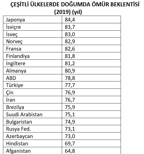2019 yılında çeşitli ülkelerde doğumda ömür (hayat) beklentisi verileri aşağıda sunulmaktadır: