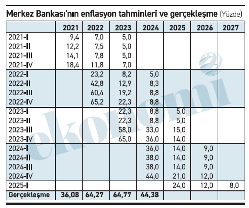 Örneğin bu yıla ilişkin olarak 2024’ün son enflasyon raporunda dile getirilen tahmin, orta noktası yüzde 21 olmak üzere yüzde 16-26 arasıydı.