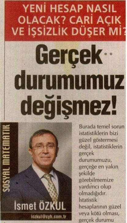 CARİ AÇIK: Cari açık, yeni hesapla hem dış ticaret açığı azalacağı için hem de turizm hesaplarında yapılacak değişiklikle gelirler daha yüksek hesaplanacağı için azalmış gözükecek. Yani gerçek durum değişmeyecek ama hesap değişecek. Yeni hesabın daha gerçekçi olup olmadığını yöntemleri açıklandığında göreceğiz.