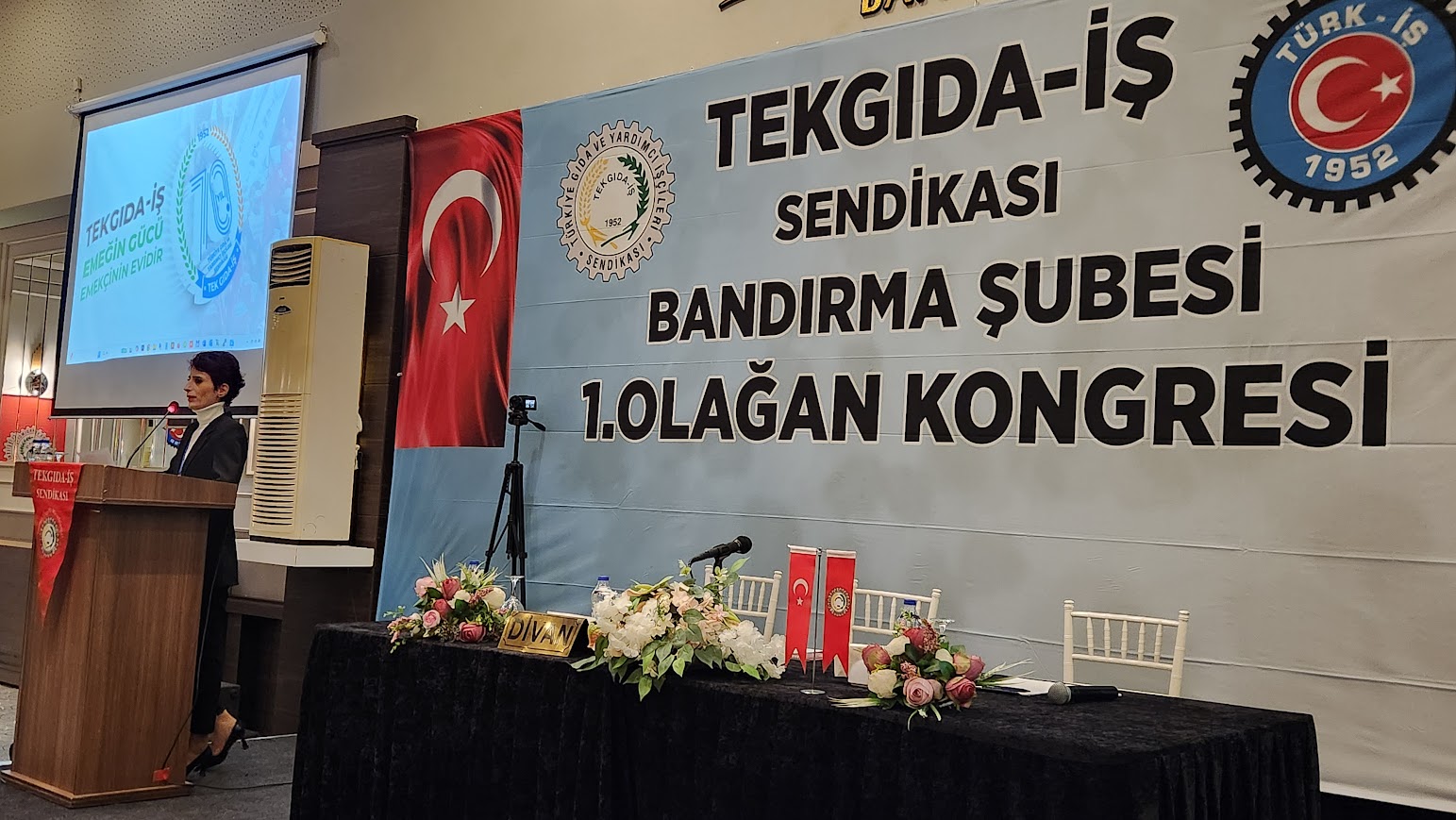 Bandırma Şubesinin kuruluşu 1955. Bandırma Şube olarak değil adı ama Bandırma, Tekgıda-İş Sendikası’nın kurucuları arasındadır. Ve adı Bandırma ve Havalisi Tütün İşçileri Sendikası’dır. Ve bir şey daha söyleyeceğim, bu sendikanın genel başkanı Türkiye’nin ilk ve tek kadın genel başkanıdır. Adı Dervişe Koçoğlu ve Alparslan Türkeş Beyin de kız kardeşidir. Ve 11 dönem genel başkanlık yapıyor.