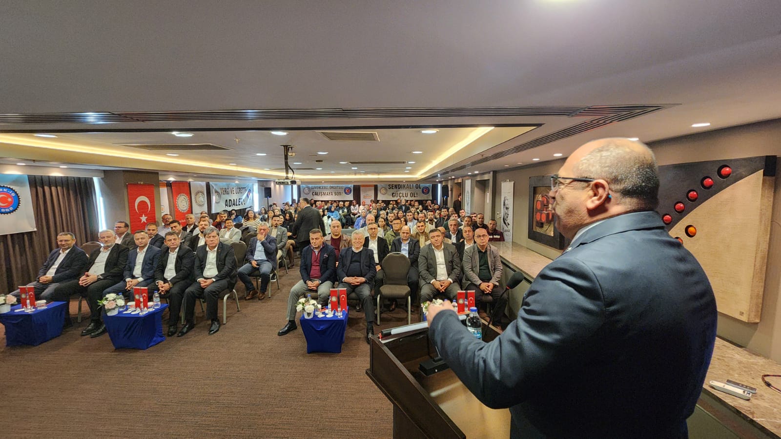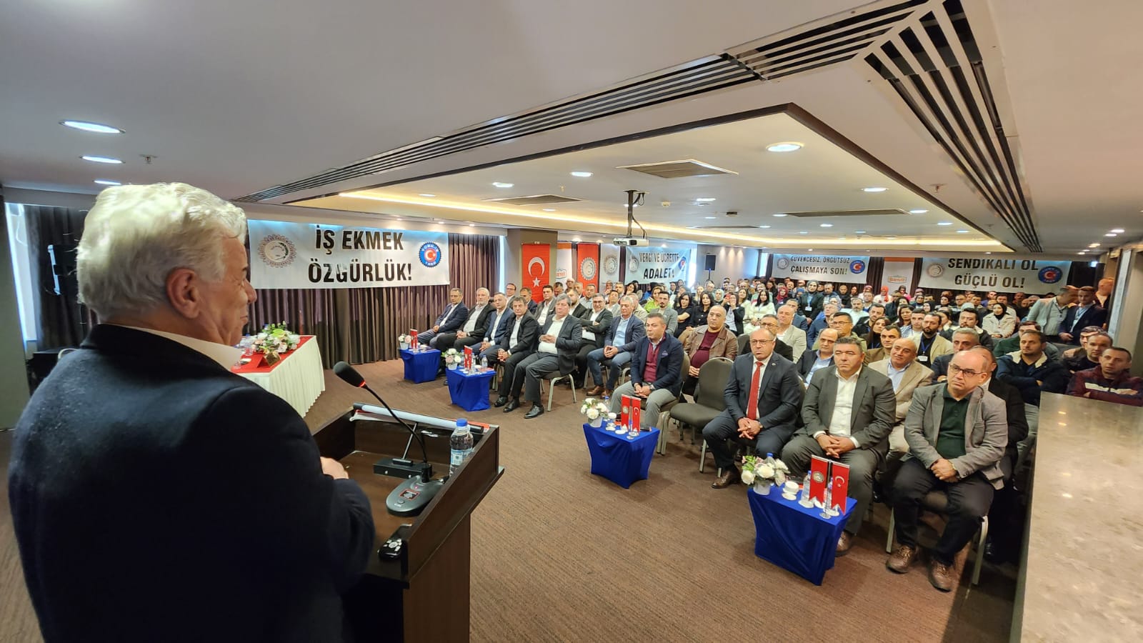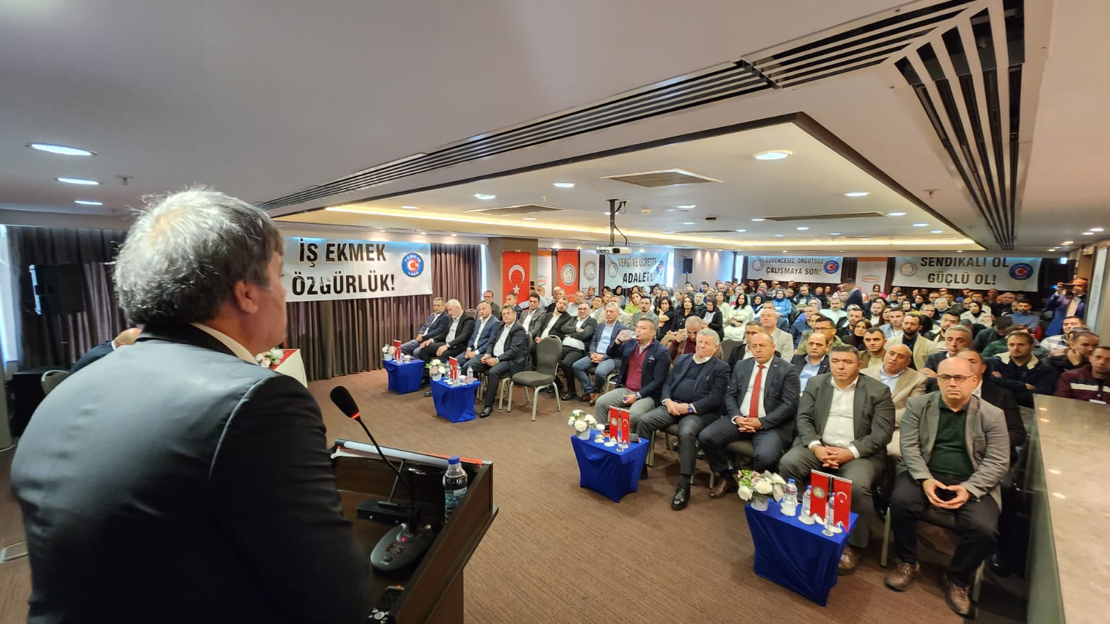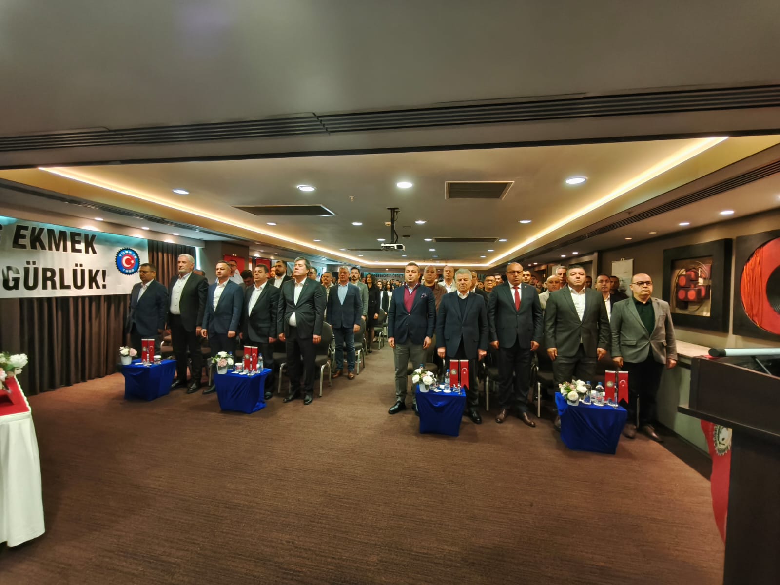 Konuşmaların ardından Genel Başkanımız Mustafa Türkel, bir konuşma yaptı. Genel Başkanımız Mustafa Türkel, sendikamızın kuruluşundan bugüne verdiği mücadeleleri, ülkemizin içinde bulunduğu ekonomik durumu, bunun çalışanlara yansımalarını, toplu iş sözleşmelerine etkilerini, asgari ücret tartışmalarını değerlendirdi. Genel Başkanımız Mustafa Türkel’in konuşmasının satır başları şöyle: