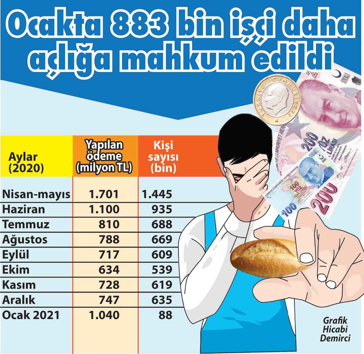 Ücretsiz izin desteği, işçisini işten atmak isteyen patronlara yaradı. İşverenler sadece ocak ayında 883 bin işçiyi evine gönderip maaş ödemekten kurtuldu.