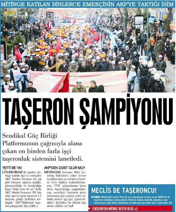 Sendikal Güç Birliği Platformunun çağrısıyla alana çıkan on binden fazla işçi taşeronluk sistemini lanetledi.