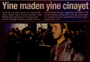 Kozlu´da meydana gelen iş cinayetinde sekiz maden işçisi hayatını kaybetti. Star Madencilik adlı taşeron firmaya bağlı işçilerin öldüğü faciada yaralılar da var. Daha büyük facianın eşiğinden dönüldü. TTK kontrol ekipleri patlamanın olduğu yere yakın bir noktada dinamit patlatılmasına son anda engel oldu.