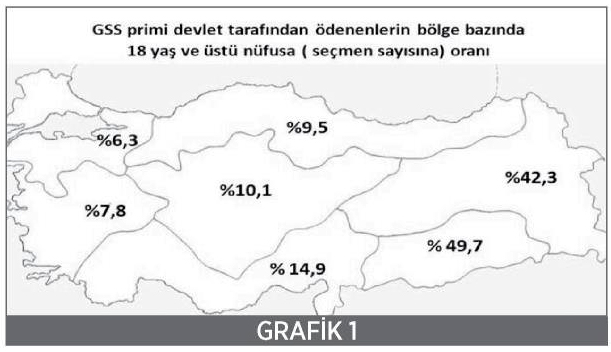 Türkiye’de herhangi bir kapsamda sosyal güvencesi olmayan, çalışmayan, 18 yaşını doldurmuş ve öğrenci olmayan, aylık geliri asgari ücretin üçte birinden az olan ve genel sağlık sigortası (GSS) primi devlet tarafından ödenenlerin 18 yaş ve üstü nüfusa (seçmen sayısına) oranı yüzde 14,6 (Türkiye ortalaması). Bu oran Doğu Anadolu Bölgesi’nde yüzde 42,3, Güneydoğu Anadolu Bölgesi’nde ise yüzde 49,7