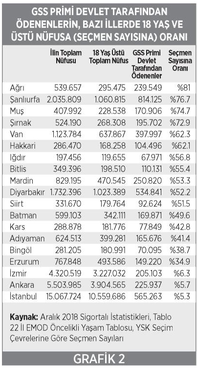 2018 yılında GSS primleri devlet tarafından ödenenlerin sayısı toplam il seçmen sayısına oranlandığında, Ağrı (yüzde 81) ilk sırada yer alıyor. Kişi bazında ise Urfa (814 bin 215) ilk sırada. Urfa’daki sayının İstanbul’dan çok fazla olması dikkat çekici (Grafik 2).