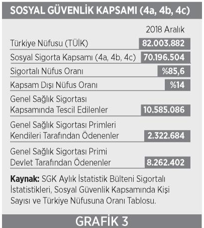 Çağdaş dünyada tüm ülkeler sosyal güvenliği devletler için bir kamu görevi, kişiler için ise bir hak olarak tanımış durumda. Ancak sosyal güvenlik sistemini “kim batırdı, kâr-zarar, açık vs” argümanlarla şirket gibi gören iktidar sahipleri, sosyal güvenlik kap-samını yüzde 99 olarak belirten gazete ilanları veriyor. Böylece sanal bir iyilik hali oluşturmaya çalışıyorlar. Buna karşın SGK’nin resmi verilerine göre gerçek oran yüzde 85,6 (Grafik 3).