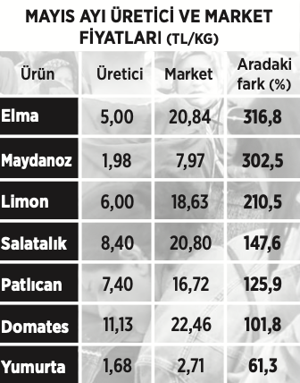 Türkiye Ziraat Odaları Birliği (TZOB) Genel Başkanı Şemsi Bayraktar, mayısta üretici ve market arasındaki fiyat farkını açıkladı. TZOB’un üretici-market fiyat kıyasına göre, mayısta elma 4,2, maydanoz 4, limon 3,1 ve mercimek 2,8 kat daha pahalıya markette satıldı. Markette 37 ürünün 23’ünde fiyat artışı olduğunu belirten Bayraktar, yüzde 84,8 ile en fazla havucun fiyatının arttığını söyledi. Üretici ile market arasındaki fiyat farkı en fazla yüzde 316,8 ile elmada görüldü. Bayraktar, “Üreticide 5 lira olan elma markette 20 lira 84 kuruşa, 1 lira 98 kuruş olan maydanoz 7 lira 97 kuruşa, 6 lira olan limon 18 lira 63 kuruşa, 55 lira olan kuru incir 164 lira 97 kuruşa, 25 lira olan kuru üzüm 70 lira 83 kuruşa, 13 lira 84 kuruş olan kırmızı mercimek 38 lira 93 kuruşa tüketiciye satıldı” dedi. Beklenen buğday alım fiyatına ilişkin de konuşan Bayraktar, “Yüksek maliyetlerini karşılayacak, makul bir refah payı bırakacak fiyat istiyorlar” ifadelerini kullandı.