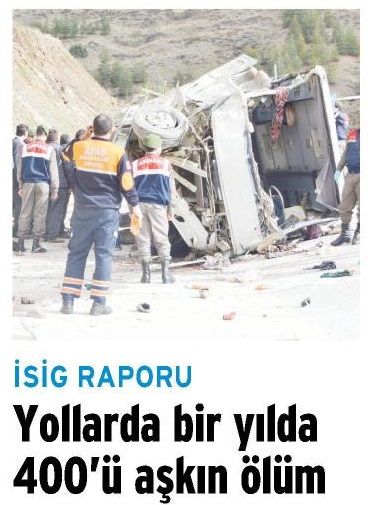 İŞÇİ Sağlığı ve iş Güvenliği (İSİG) Meclisi´nin önceki gün açıkladığı ´2014 Yılı iş Cinayetleri Raporu´na göre, en çok iş cinayeti yine yollarda meydana geldi. Trafik/ servis kazası nedeniyle yaşamını yitiren işçi sayısı 2013´te en az 433 iken, 2014 yılında en az 421 olarak saptandı.