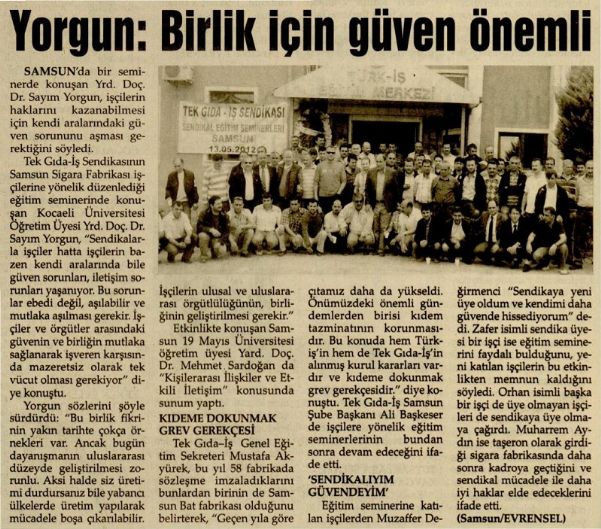 Tek Gıda-İş Sendikasının Samsun Sigara Fabrikası işçilerine yönelik düzenlediği eğitim seminerinde konuşan Kocaeli Üniversitesi Öğretim Üyesi Yrd. Doç. Dr. Sayım Yorgun, "Sendikalarla işçiler hatta işçilerin bazen kendi aralarında bile güven sorunları, iletişim sorunları yaşanıyor. Bu sorunlar ebedi değil, aşılabilir ye mutlaka aşılması gerekir. İşçiler ve örgütler arasındaki güvenin ve birliğin mutlaka sağlanarak işveren karşısında mazeretsiz olarak tek vücut olması gerekiyor" diye konuştu.