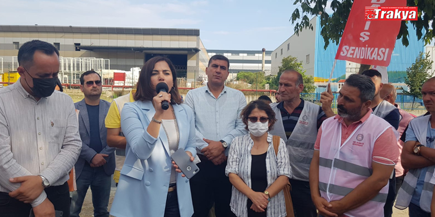 “Bugün sadece Tekirdağ’da değil Türkiye’nin dört bir yanında işi için, hakları için, ekmek ve hürriyet mücadelesi verenler var onlara buradan da selam olsun diyorum. Sizler, kazanacaksınız çünkü bir aradasınız, çünkü haklısınız, çünkü kurtuluşun tek başınıza olmayacağını biliyorsunuz, çünkü ya hep beraber ya hiçbirimiz diyorsunuz. Haklısınız görüyoruz, Anayasa ortada, yasalar çok açık. Peki bu emek düşmanları gücü nereden alıyorlar? Size bunları nasıl yapabiliyorlar? Değerli işçi kardeşlerim emeğe ve alın terine karşı OHAL ilan eden ve bundan istifade edip grevleri yasaklayan bir zihniyet var. Pandemide gördünüz, yaşadınız. İşçiler, günlük 39 liraya geçinmeye zorlandı. Maalesef bütün politikalar sayılan bir elin parmaklarını geçmeyecek sermayedarları güçlendirmeye yönelik. Patronların rahatı için çalışılıyor. Devletin imkânları patronlar için kullanılıyor.