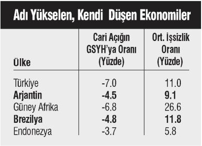 Son beş yıldır, yükselen ekonomiler düşmeye başladı. Hepsi zorda. Finansal liberalizasyon bu ülkelerin posalarını çıkardı. Arjantin IMF’ nin kapısında. Çünkü bu ekonomiler yüksek dış açıklar verdi. İşsizlik arttı. Bu defa yükselen ülkeler kırılgan ülkeler oldular. Bunların başında hep Türkiye geldi. O kadar ki beş sene önce BM bile Türkiye yi en kırılgan ülke olarak ilan etti. Beş kırılgan ülke üç kırılgan ülke oldu. Tablo değişti..