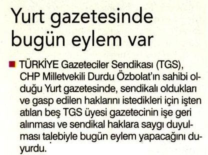 TÜRKİYE Gazeteciler Sendikası (TGS), CHP Milletvekili Durdu Özbolaf in sahibi olduğu Yurt gazetesinde, sendikalı oldukları ve gasp edilen haklarını istedikleri için işten atılan beş TGS üyesi gazetecinin işe geri alınması ve sendikal haklara saygı duyulması talebiyle bugün eylem yapacağını duyurdu.