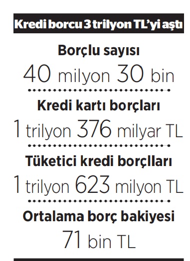 Derinleşen ekonomik kriz ve artan hayat pahalılığı nedeniyle çıkmaza giren yurttaşın bankalara olan borcu katlandı. Bankacılık Düzenleme ve Denetleme Kurumu (BDDK) verilerine göre tüketici kredileri ve kredi kartı harcamaları son bir yılda yüzde 67,6 oranında arttı. BDDK, tüketici kredileri ve bireysel kredi kartları harcamaları mart sonu itibariyle 3 trilyon 100 milyon liraya yükseldi. Türkiye Bankalar Birliği Risk Merkezi’nin mart ayında yayımladığı son verilere göre, bireysel kredi kullanan kişi sayısı son bir yılda 2 milyon kişi artarak 40 milyon kişi olurken ortalama kredi bakiyesi ise 71 bin TL düzeyinde gerçekleşti.