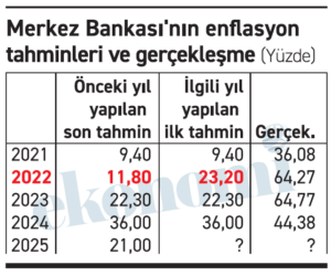 Ama yıl yüzde 36’da kapatılınca 27 Ocak 2022’de açıklanan yılın ilk raporunda yıllık tahmin yüzde 23,2’ye çıkarıldı. Kaldı ki o tahminin de ne kadar düşük olduğu daha ilk aydan anlaşılacaktı. 2022’nin ocak ayında yüzde 11,10 ile yine çift haneli bir artış yaşanmış, zaten yıl da yüzde 64 düzeyinde kapatılmıştı.