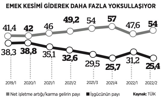 Uygulanan ekonomi politikaları sonucunda ülke ekonomisi, yoksullaştıran büyüme ağında sıkıştırıldı. Adil olmayan büyümeden emek kesiminin aldığı pay yılın ikinci çeyreğinde yüzde 25,4’e gerilerken sermaye kesimlerinin kârı yüzde 54’e yükseldi.