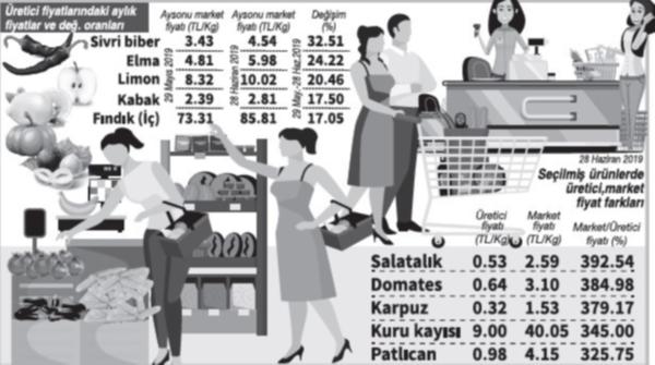 Üretici ve market arasındaki fiyat farkı haziranda en fazla yüzde 392.54 ile salatalıkta görülürken, fiyat farkı domateste yüzde 384.98, karpuzda yüzde 379.17, kuru kayısıda yüzde 345, patlıcanda yüzde 325.75 oldu.