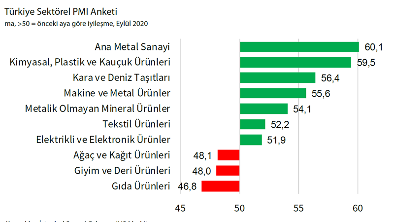 İstanbul Sanayi Odası (İSO) Türkiye İmalat PMI (Satın Alma Yöneticileri Endeksi) eylülde 52.8’e geriledi. Endeks ağustos ayında 54.3 seviyesindeydi. Temmuzda ise 56.9 olarak ölçülmüştü. Salgın tedbirlerinden çıkışla birlikte endekste hızlı bir toparlanma görüldü. Sonrasında ise bir dengeye oturma söz konusu. Anlaşılan önümüzdeki aylarda imalat, faaliyetlerin arttığı anlamına gelen 50 seviyesinin üzerinde kalsa da sınıra yakın seyredecek. İstanbul Sanayi Odası Türkiye Sektörel PMI eylül verilerine göre de 10 sektörün çoğunluğunda faaliyet koşulları iyileşmeyi sürdürdü, ancak bazı alanlarda zayıflıklar devam etti. Ana metal ile kimyasal, plastik ve kauçuk sektörleri büyümede başı çekerken, gıda ürünleri ile giyim ve deri ürünleri gibi sektörlerde faaliyet koşulları yavaşladı. Üretim 10 sektörün sekizinde artış gösterirken, en hızlı üretim artışı kimyasal, plastik ve kauçuk kategorisinde gerçekleşti. Üretimi azalan sektörler giyim ve deri ürünleri ile gıda ürünleri oldu.