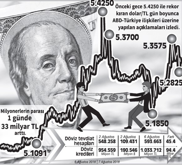 Türkiye ekonomisindeki sorunlar, ekonomi yönetimi ile Merkez Bankası’na duyulan güvensizlik ve son olarak gerilen ABD -Türkiye ilişkilerinin etkisiyle kur rekor üstüne rekor kırarken bu dönemin kazananı yine zenginler oldu. Dolar önceki güne 5.11 seviyelerinden başlamıştı. Gece saatlerinde gelen son rekor 5.4250 oldu. Buna göre kur bir günde 31.5 kuruş artarken, 100 bin doları olan 24 saat içinde 31 bin 500 lira kazandı. 10 bin doları olanın kazancı 3 bin 150 lira olurken 1 milyon doları olanın cebine fazladan 315 bin lira girdi.
