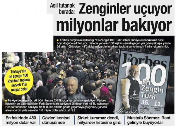 Forbes dergisi Türkiye’nin en zengin 100 kişisinin servetini açıkladı. Listeye göre en zengin 100 kişinin serveti bir yıl içerisinde 24,75 milyar dolar artarak 117,85 milyar dolara çıktı. Başka bir ifadeyle Türkiye ekonomisi 2012’nin ilk üç çeyreğinde ortalama yüzde 2,6 büyürken, en zenginlerin şahsi serveti yüzde 25,8 arttı. Böylece en zenginlerin toplam serveti son yedi yılın rekorunu kırdı.